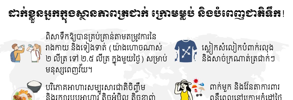[English Below] នៅក្នុងអំឡុងពេលដែលមានអាកាសធាតុក្តៅ សូមយកចិត្តទុកដាក់ថែរក្សាសុខភាពរបស់អ្នក ដោយផឹកទឹកឱ្យបានទៀងទាត់ ស្នាក់នៅក្នុងផ្ទះ ឬកន្លែងមានម្លប់ រក្សារបបអាហារ និងអនាម័យឱ្យបានល្អ។ ការអនុវត្តទាំងនេះនឹងជួយការពារ ថែរក្សាសុខភាពកុមារ គ្រួសារ និងសហគមន៍ពីបញ្ហាសុខភាពដែលអាចកើតមាន។ សូមអនុវត្តតាមវិធានការដូចខាងក្រោម៖ During hot weather, take extra care of your health by drinking water regularly, staying indoors or in shaded areas, and maintaining proper nutrition and hygiene. These practices help protect children, families, and communities from potential health risks. Follow these practices: #HotWeatherCare […]